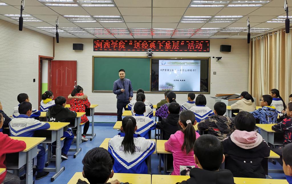 为贯彻落实教育部、国家语委《中华经典诵读工程实施方案》和《甘肃省教育厅关于组织开展“送经典下基层”活动的通知》精神,11月13日,党委常委、副校长张勇带领学校 “送经典下基层”小分队赴天祝县朵什镇松林学校开展“送经典下基层”活动。