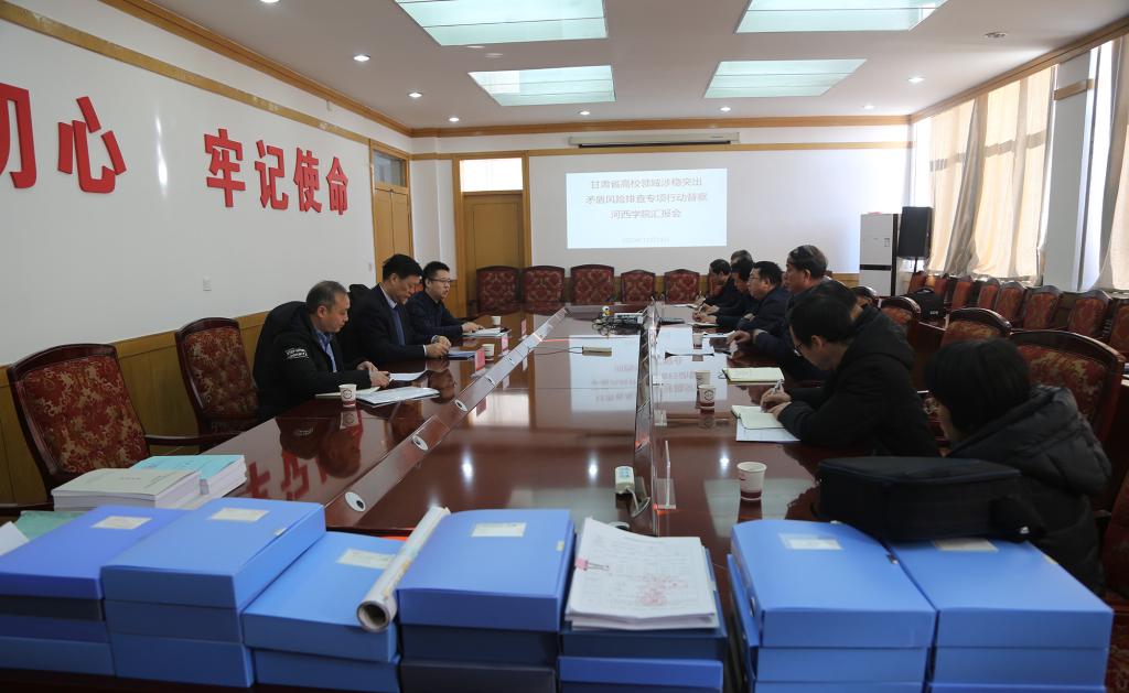 12月24日,省教育厅专项安全工作督查组在第七督查组副组长、甘肃政法大学副校长唐伟尧的带领下来学校检查指导工作。学校党委常委、副校长顾长兆代表学校向督查组进行了工作汇报,学校办公室、宣传部、安全稳定工作部、学生工作部、基本建设与后勤管理处、实验室管理中心和团委等部门负责人参加了汇报会。