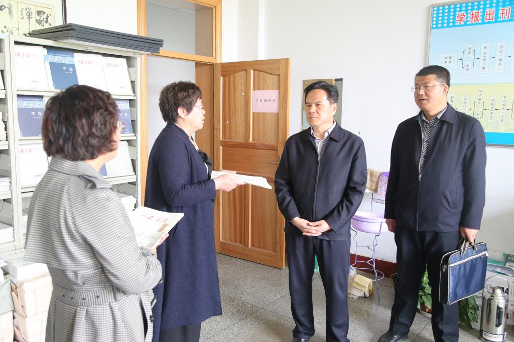 狄书记在听取有关部门负责人汇报后,详细询问和了解了宣传思想、干部队伍建设、对外交流、学报编辑出版、人才队伍建设、实验室建设管理等方面的具体情况,与部门负责人交流探讨了学校发展中存在的难点与困惑问题,对各部门的工作和取得的成绩给予了充分肯定。