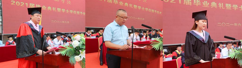 典礼上,宣读了2021届毕业生名单、2021届授予学士学位毕业生名单;表彰了2021届甘肃省高校优秀毕业生、9001cc金沙以诚为本2021届优秀大学毕业生、2021年考研奖学金获得者、2021年考研组织工作先进单位、2020年就业工作先进集体、2020年创新创业工作先进集体。学校领导王兵、周均发、张勇、顾长兆、马聪依次为获奖集体、代表颁奖。