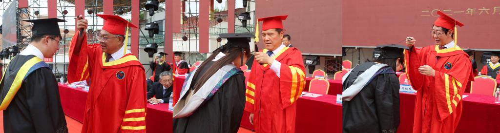 党委书记狄生奎教授、校长张汉燚教授、党委常委、副校长张勇教授以及二级学院学位评定分委员会主席为获得学士学位的毕业生正冠拨苏。