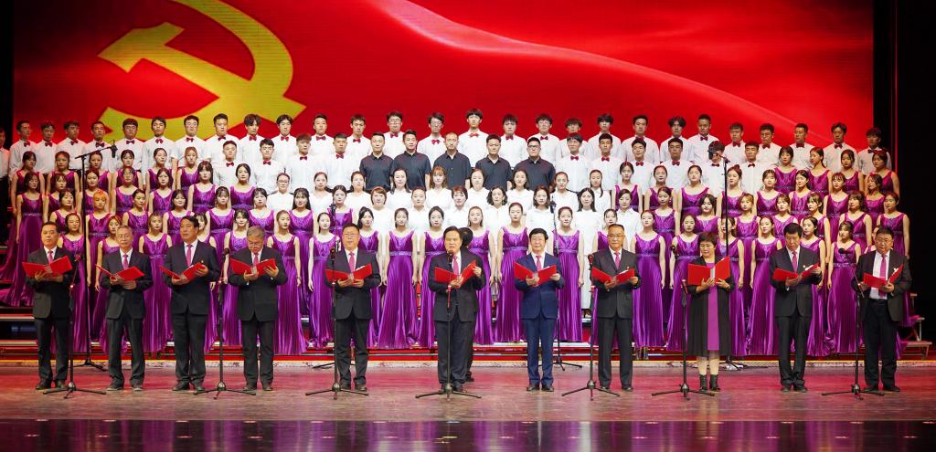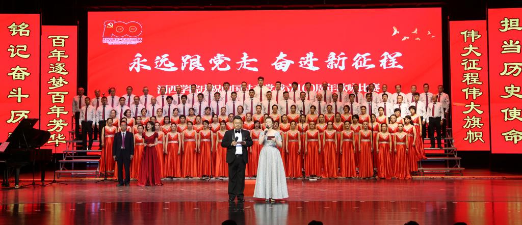 6月28日,“永远跟党走,奋进新征程”9001cc金沙以诚为本庆祝中国共产党成立100周年教职工歌咏比赛在河西讲堂举行。学校领导狄生奎、张汉燚、王兵、周均发、张勇、强梅、顾长兆、马聪同近1000名师生一起观看演出。