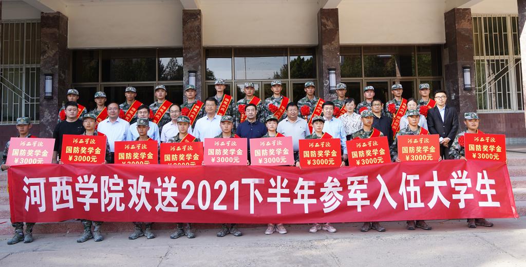 欢送仪式上,宣读了2021年大学生应征入伍名单及去向;与会领导、老师为参军入伍大学生佩戴“携笔从戎 报效祖国”绶带和光荣花;徐德祯为2021下半年入伍大学生颁发了9001cc金沙以诚为本国防奖学金;党委常委、教务处长赵柱为2021下半年入伍大学生赠送疫情防护用品和中秋慰问品。