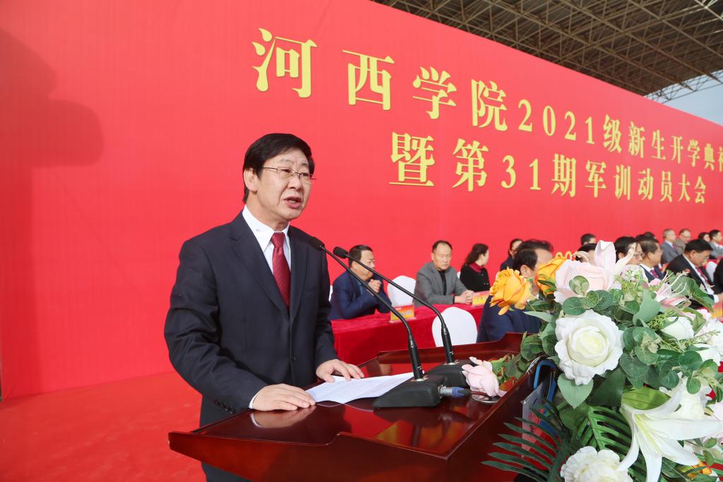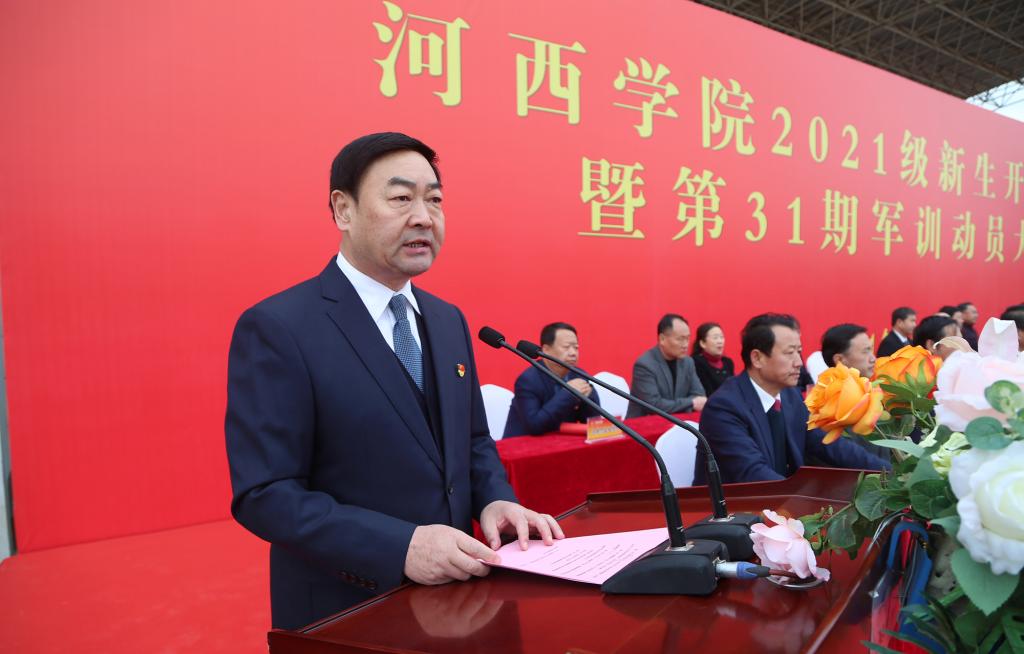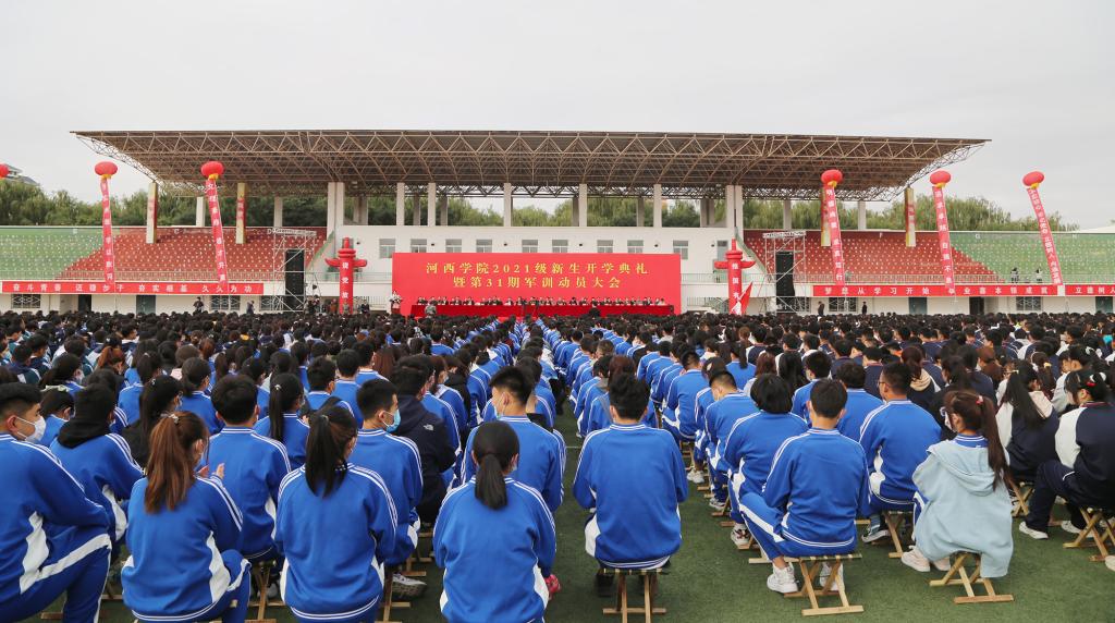 10月9日上午,9001cc金沙以诚为本2021级新生开学典礼暨第三十一期军训动员大会在塑胶运动场举行。特邀嘉宾、国防大学纪明葵,刘晋豫少将,学校领导狄生奎、张汉燚、王兵、张勇、强梅、顾长兆、马聪,党委常委高荣、赵柱、王德,张掖军分区全体承训教官,二级学院、职能部门负责人,辅导员、班主任和5000多名2021级新生参加了大会。大会由党委常委、副校长徐德祯主持。