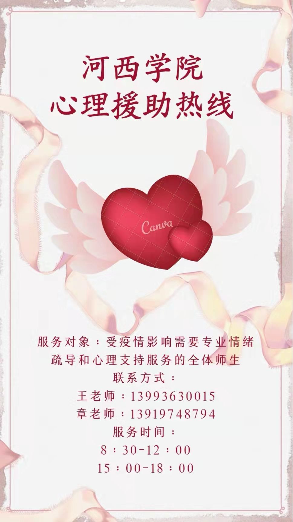 热线电话,真情守护——暖心。针对学生公寓封闭管理给学生心理可能带来的各种影响,有效帮助学生消除焦虑和不安情绪,以积极理性、平和心态面对疫情,自10月23日起,学校开通了疫情期间心理援助热线,安排专业老师为同学们提供一对一热线咨询和心理服务。此外,学校向学生推荐了教育部华中师范大学心理援助热线平台、甘肃省级医疗机构心理咨询服务热线、甘肃省共青团心理志愿服务团队等平台供学生选择使用。