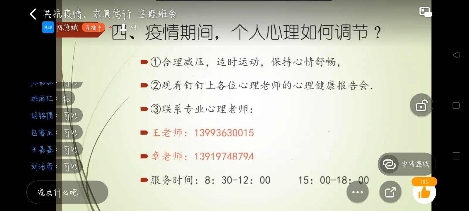 学校在特殊时期举行主题班会,以此引导广大同学同困难作斗争,是物质的角力,也是精神的对垒。同学们在班级交流群中纷纷表示,“从自身做起,克服疫情的负面影响,提升线上教学课堂效果”“让我们一起携手相守,共战疫情,献青春力量”“彰显大学生责任与担当,共同打赢疫情防控阻击战”。