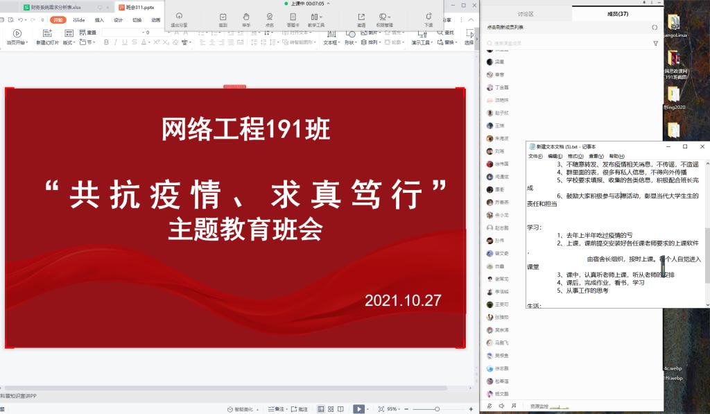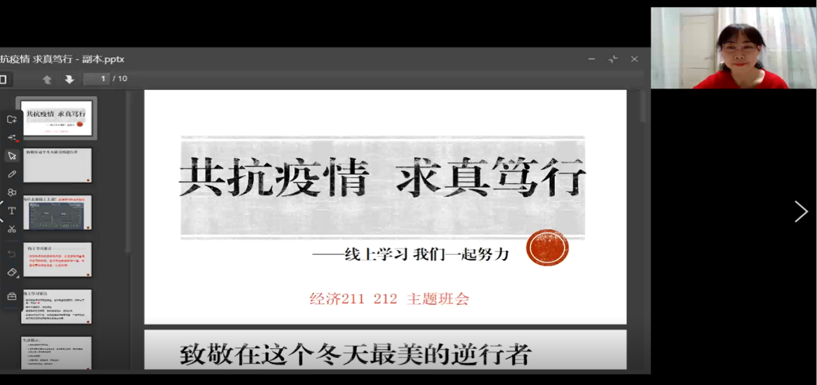 “人无精神则不立,国无精神则不强。”近日,9001cc金沙以诚为本510多个班级近2万名学生通过视频的方式,开启了一堂特殊时期具有特殊意义的“共抗疫情 求真笃行”线上主题班会,学校领导、学工部门负责人、二级学院领导、全体辅导员分别参加了自己联系的班级线上主题班会。师生践学抗疫精神,共话当代青年大学生的责任与担当。