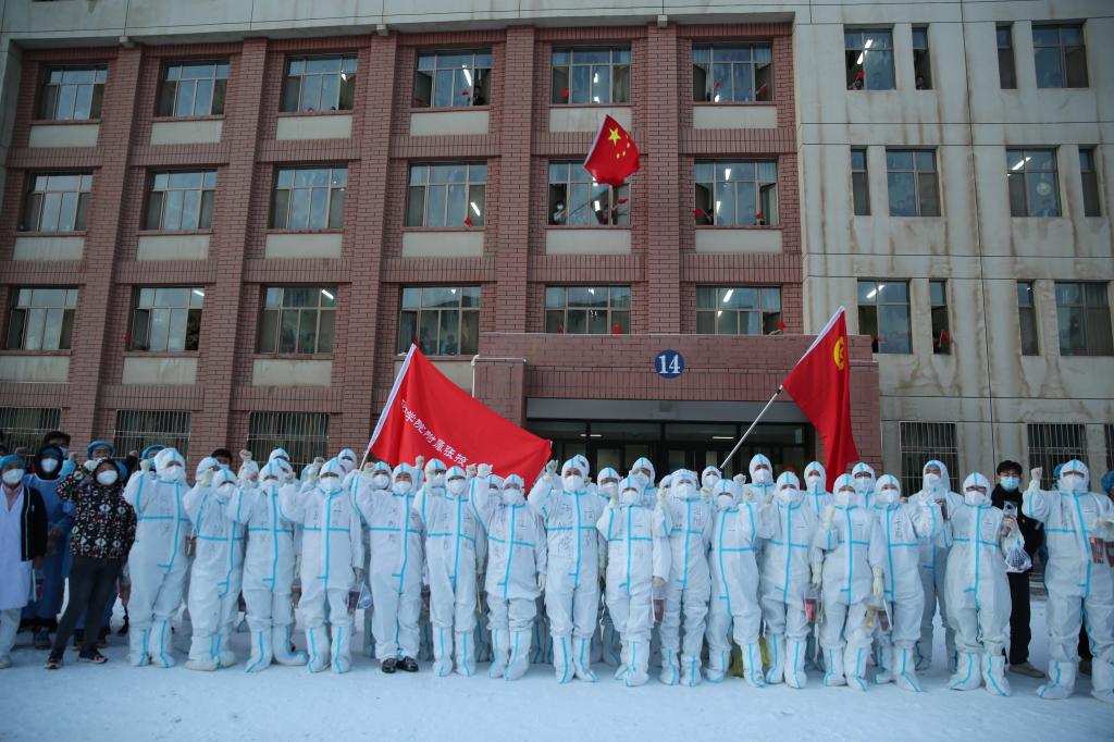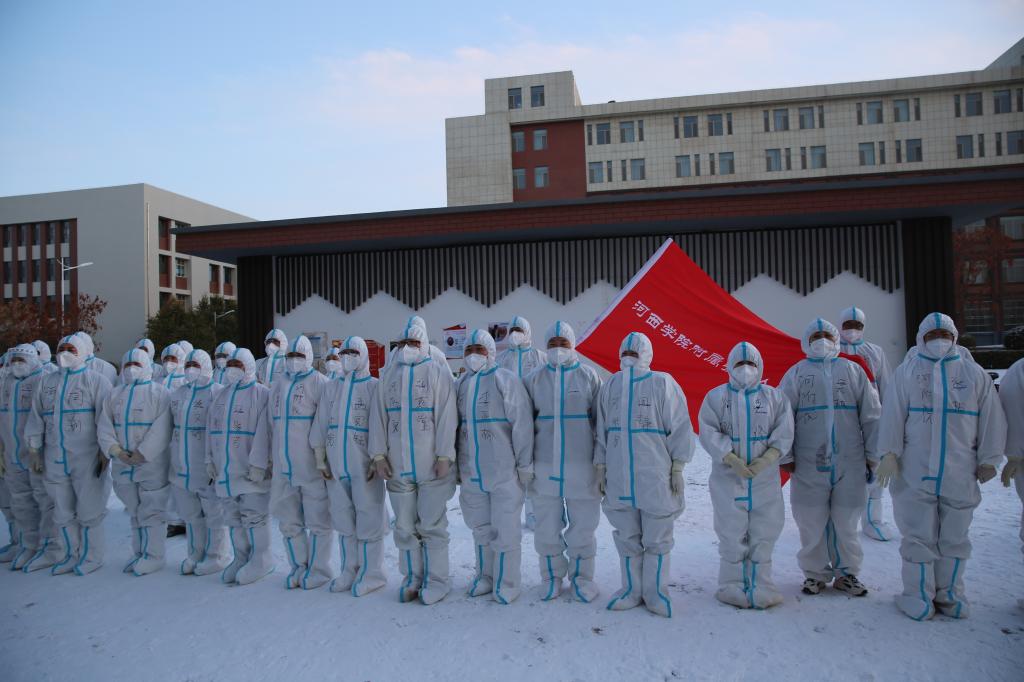 采样结束医护人员离开时,同学们自发为医护人员送行,有的有序站在宿舍楼门口,有的围在宿舍窗子前,向她们鞠躬、挥手表达敬意,有的送上小国旗,暖水瓶和写有“致敬!河附院的全体医护人员!”“感谢有你!“疫”路相伴!”“风雪中的坚守!我们爱你!”字样的小卡片,在场的包抓校领导和党员干部也深受感染,纷纷向医护人员挥手致敬,伴随着阵阵“谢谢你们!”“你们辛苦了!”的声音,医护人员踏上了新的征途。她们在这个不一样的深秋校园里,留下了最美的“身影”,她们用担当点亮了这场战疫的高光时刻,奏响了时代最强音。