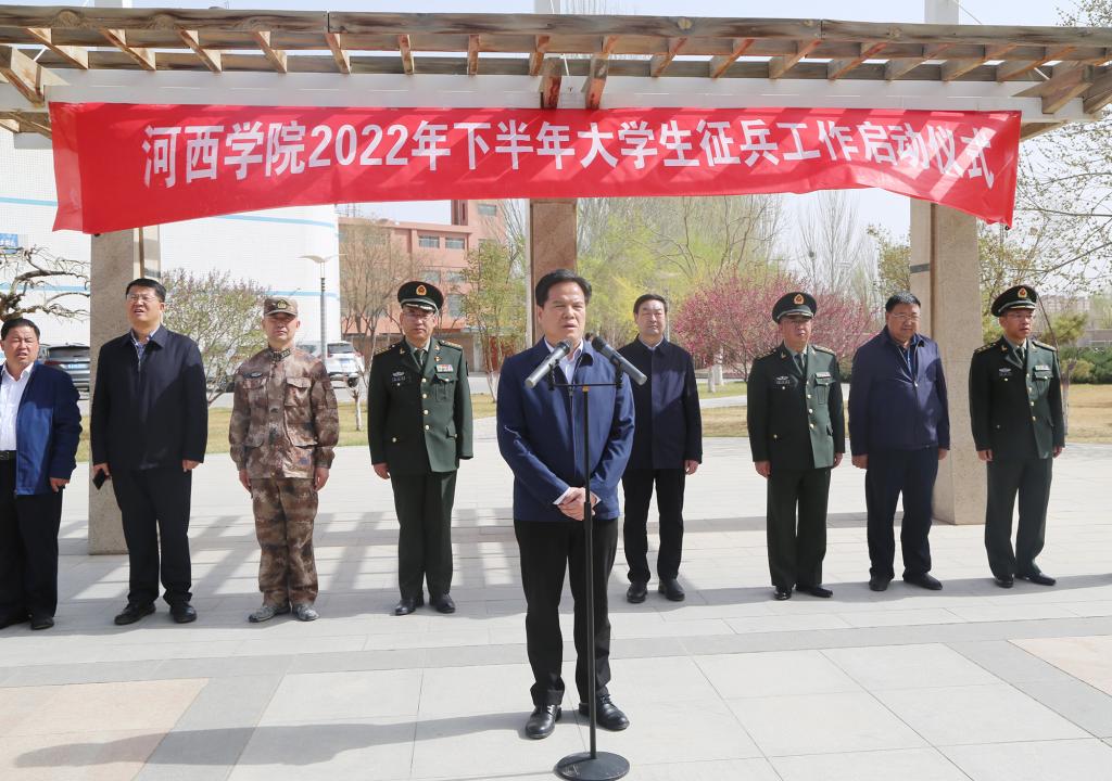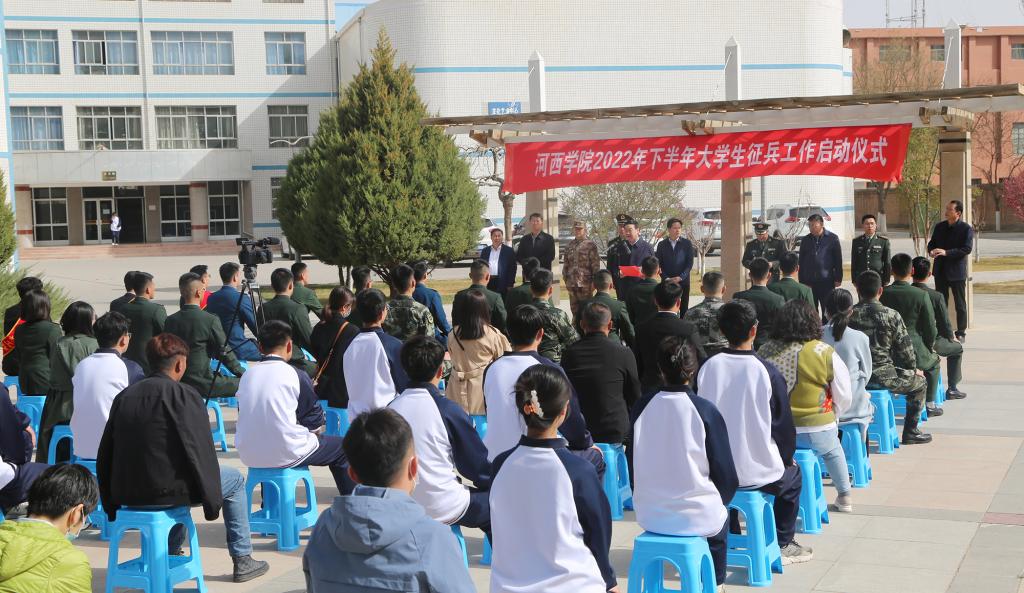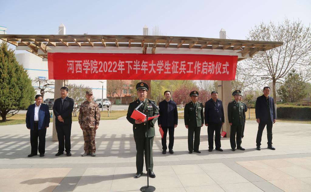 4月8日,9001cc金沙以诚为本2022年下半年学生征兵工作启动仪式在音乐楼前广场举行。张掖军分区副司令员、张掖市人民政府征兵办公室主任张洪峰,学校征兵工作领导小组组长、党委书记狄生奎,张掖军分区动员处处长魏辉明,甘州区委常委、甘州区人民武装部政治委员陈艺,甘州区人民武装部部长张建伟,以及张掖军分区、甘州区人民武装部,学校办公室、人民武装部、学生工作部、二级学院主管大学生征兵工作辅导员,退役大学生征兵宣传员代表参加了仪式。学校征兵工作领导小组副组长、党委常委、副校长徐德祯主持启动仪式。