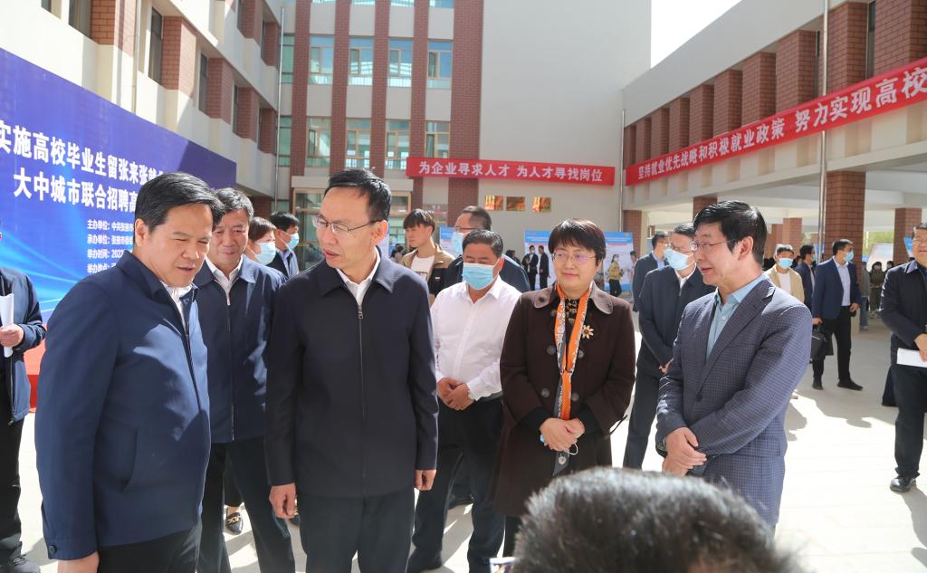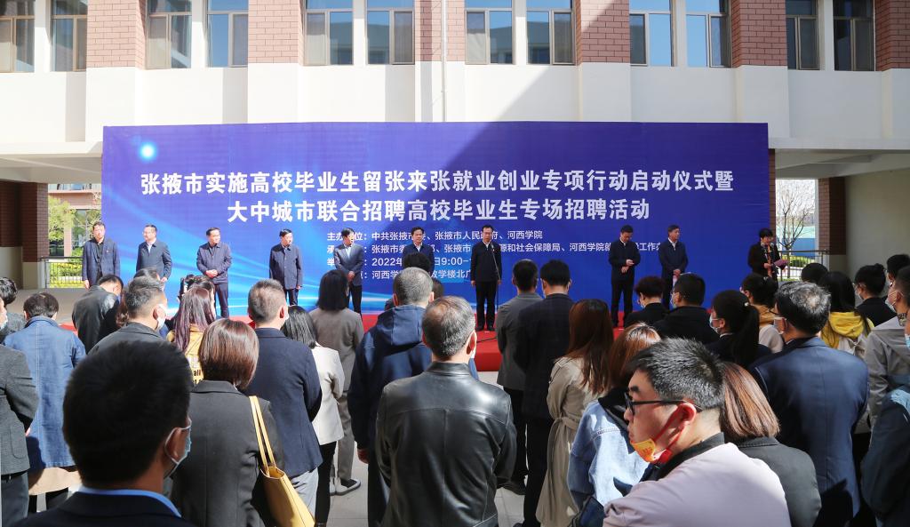 为贯彻落实党中央、国务院“稳就业”“保就业”决策部署, 全面落实教育部、省教育厅2022届高校毕业生就业创业工作网络视频会议要求和学校党委的工作部署,同时为深入实施新时代人才强市战略,大力推动《张掖市实施高校毕业生留张来张就业创业专项行动方案》落实落地,吸纳引导高校毕业生留张来张就业创业,4月24日,我校携手张掖市人民政府共同举办了“张掖市实施高校毕业生留张来张就业创业专项行动启动仪式暨大中城市联合招聘高校毕业生专场招聘活动”。张掖市委常委、组织部部长张文生、市政府副市长娄金华、市委副秘书长李锐、市政府副秘书长王永新、市人力资源和社会保障局局长苏培孝,市委市政府相关部门,学校党委书记狄生奎、校长张汉燚、党委常委、副校长徐德祯,学校相关部门、各学院负责人、2022届未就业毕业生、参会企事业单位共同参加了此次活动。活动由张掖市政府副市长娄金华主持。张掖市就业工作领导小组副组长、张掖市人力资源和社会保障局局长苏培孝同志介绍张掖市实施高校毕业生留张来张专项行动有关情况;张掖市委常委、市委组织部部长张文生同志宣布张掖市实施高校毕业生留张来张就业创业专项行动启动。