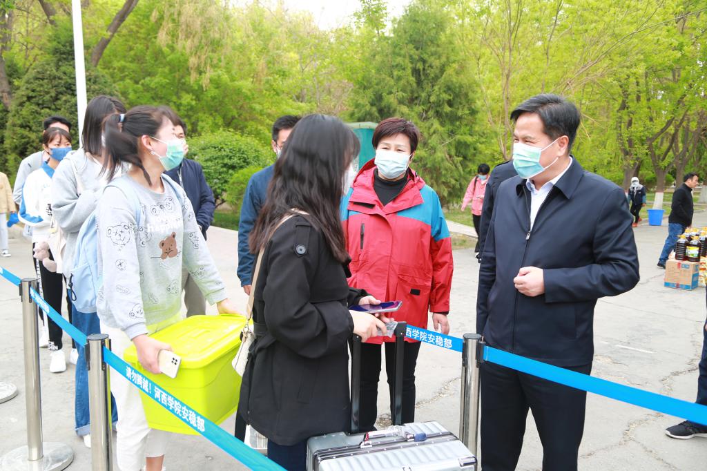 4月30日上午,党委书记狄生奎、校长张汉燚,党委常委、副校长强梅、顾长兆慰问校本部、医学校区五一假期坚守一线门岗的工作人员。学校办公室、校工会离退休教职工工作处、安全稳定工作部负责人参加慰问活动。