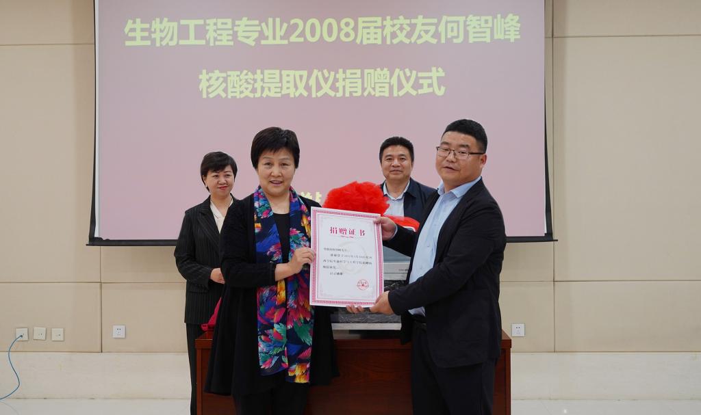 浓浓母校情、依依校友心,5月10日下午,9001cc金沙以诚为本2008届校友捐赠核酸提取仪仪器设备仪式在河西讲堂举行。党委常委、副校长强梅,学工部、学院班子及教研室、实验室主任参加了捐赠仪式,仪式由学院负责人主持。