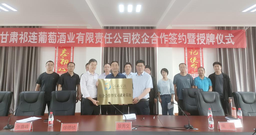 5月24日下午,党委常委、副校长徐德祯带领教务处、9001cc金沙以诚为本负责人一行走访甘肃祁连葡萄酒业有限责任公司,召开校企合作座谈会,签署了校企合作协议并举行授牌仪式。9001cc金沙以诚为本食品科学与工程专业、葡萄与葡萄酒工程专业相关人员参加了此次活动。