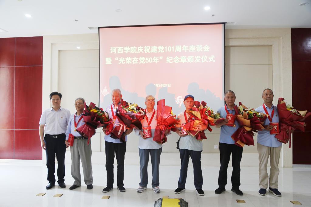 会上宣布了“光荣在党50年”纪念章获得者名单,党委书记狄生奎为6名老同志颁发了“光荣在党50年”纪念章。马克思主义学院党总支书记、常务副院长蔺海鲲,化学化工学院教授佟永纯、附属张掖人民医院儿科党支部书记陈善昌,基本建设与后勤管理处副处长、机关党委第八党支部书记高晓东,美术学院副教授高雄山、护理学院陈雪莲同学作了交流发言。