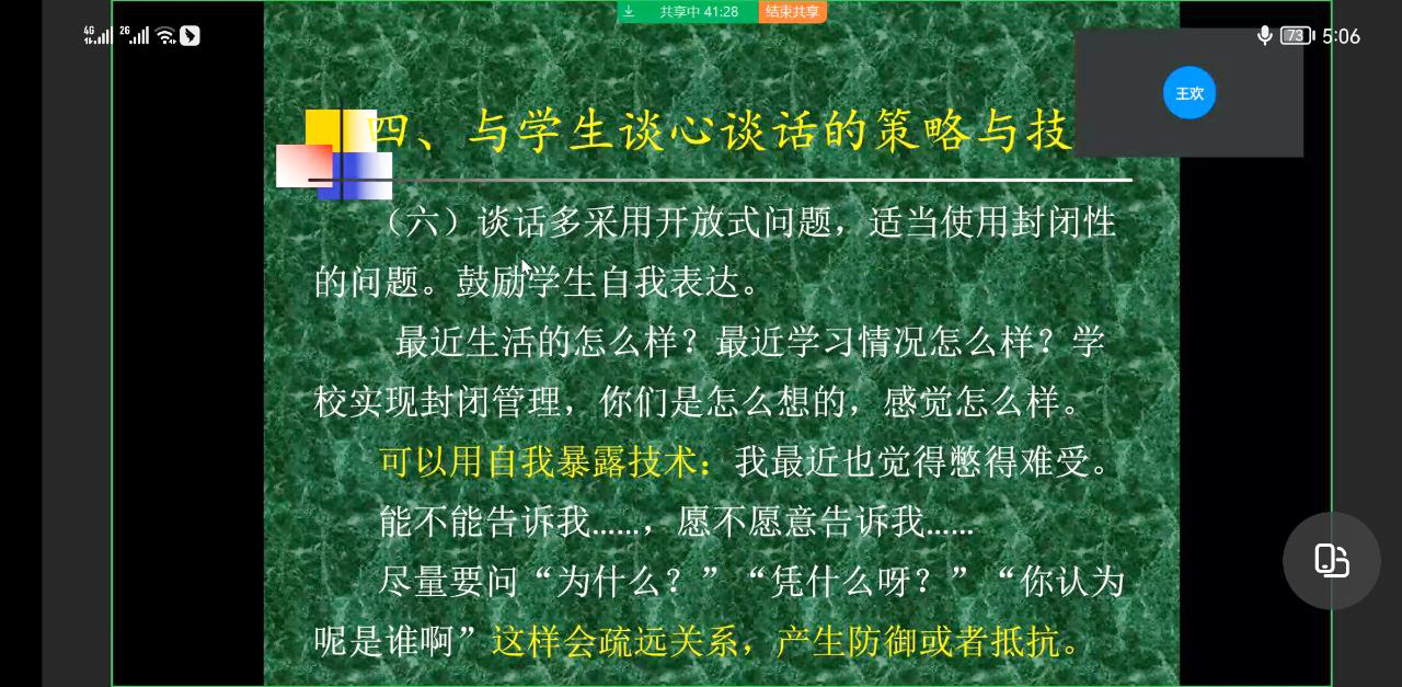 此次培训主题为“与学生谈心谈话的策略与技巧”,从新生心理普查建档的历史与效果、新生心理普查建档的工具与方法、新生心理普查的结果与使用、与学生谈心谈话的策略与技巧四个方面进行了系统的讲解。雒教授建议,班主任在与学生谈心谈话中,多采用开放性问题,适当使用封闭性问题;对待学生的态度要尊重、宽容、真诚、接纳;可使用非暴力沟通、焦点解决技术,提升沟通技巧。
