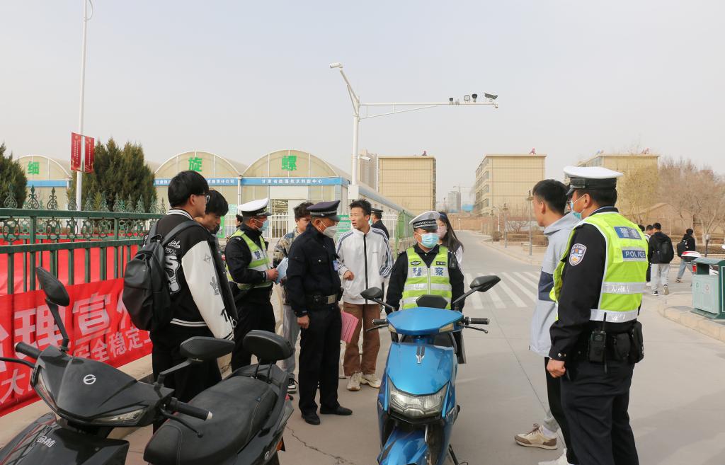 张掖市公安局甘州分局交警大队工作人员根据我校学生驾驶电动车实际情况,带领学校安保人员对过往的学生驾驶电动摩托车逐个检查,向同学们讲解驾乘电动摩托车不戴头盔、无证驾驶等交通违法行为的危害性;宣传《中华人民共和国道路交通安全法》中关于电瓶车的新的法律法规,提醒同学们尽早取得电动摩托车准驾资格,确保安全出行。同时,交警大队对安保人员如何区分电动自行车和电动摩托车及行驶条件进行培训,提升了安保人员开展电动车治理工作能力。活动期间,向校内师生、务工人员发放交通安全倡议书8000余份。
