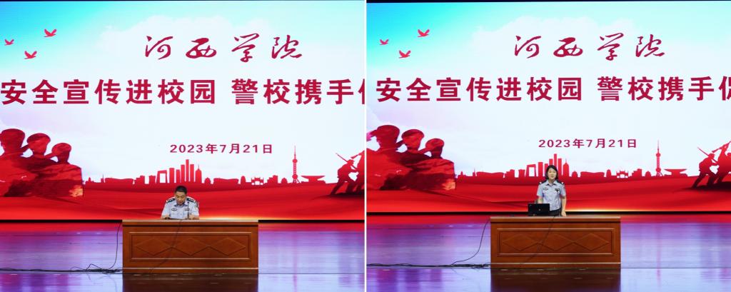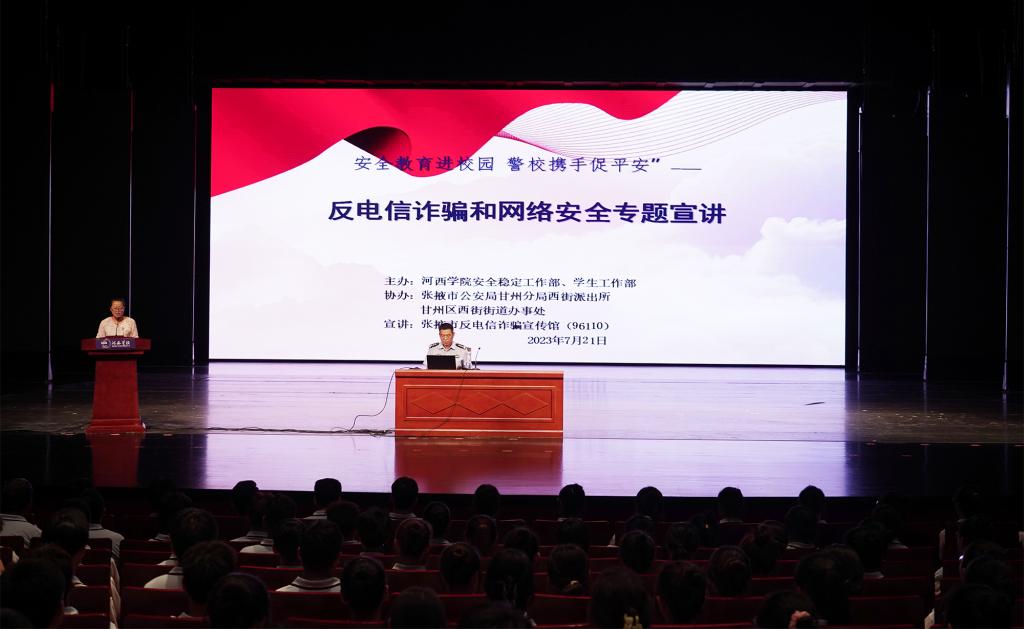 7月21日下午,学校在河西讲堂开展“安全宣传进校园 警校携手促平安”安全教育活动。邀请张掖市反电信诈骗宣传馆副馆长朱万军、甘州区西街派出所所长刘一统、张掖市公安局交警支队宣传科普法警官曹静为同学们作报告,2022级军训学生共4900余人参加了本次活动。宣讲会同时在校本部九教和医学校区教学楼设分会场进行直播。