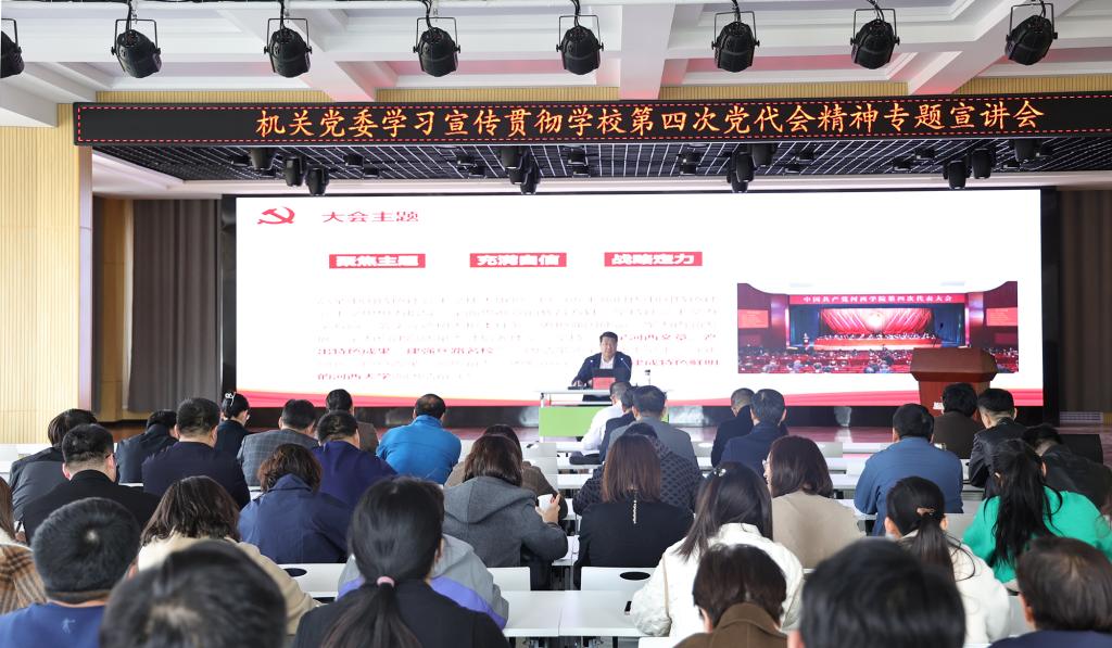3月21日,机关党委组织召开学习宣传贯彻学校第四次党代会精神专题宣讲会。党委常委、组织部部长、党委办公室(院长办公室)主任杜明奎教授主讲。会议由机关党委书记曹斌主持,机关八个党支部120多名党员参加此次宣讲会。
