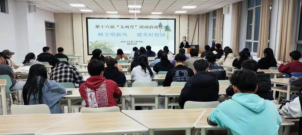 为大力推进校园精神文明建设,进一步培育和践行青年大学生社会主义核心价值观。3月25日,农业与生态工程学院举办“树文明新风·建美好校园”第十六届文明月系列活动启动仪式,学院辅导员、学院团委学生会全体成员及各班班委参加启动仪式。