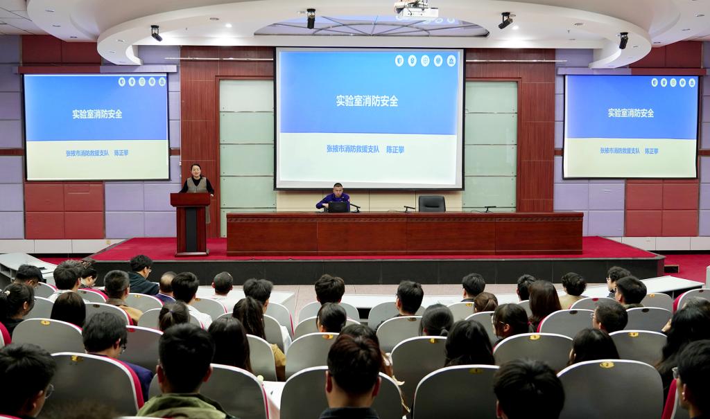 隐患险于明火,防范胜于救灾。为增强学校师生的消防安全意识,普及消防知识,提高消除安全隐患、应对火灾等突发事件的整体能力,3 月 25 日下午,实验室管理服务中心邀请张掖市消防支队全媒体中心主任陈正攀来校开展“高校实验室消防安全知识培训”专题讲座。各二级学院(科研平台)实验室主任、实验室管理人员,及部分学院学生代表200 余人参会。