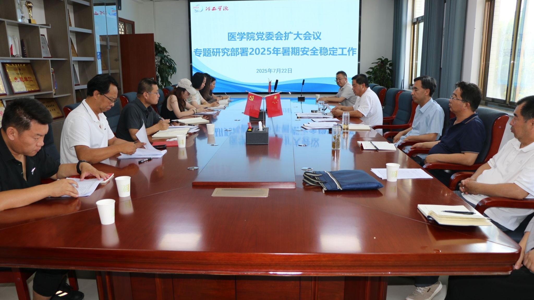 为全面落实暑期安全稳定工作,7月22日,医学院党委召开党委会(扩大)会议专题研究部署2025年暑期安全稳定工作。学院党委委员、班子成员、各科室负责人、各党支部书记参加会议。