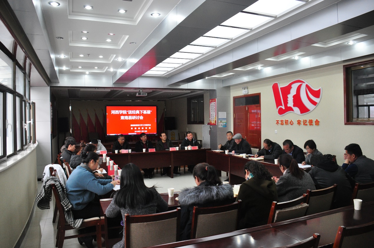 11月12日下午,小分队与肃南县语委、教育局召开了“送经典下基层”研讨会。经过会议讨论,双方就肃南县中小学经典诵读校本课程的编写,教师普通话培训与测试,9001cc金沙以诚为本大学生暑期社会实践活动中经典诵读送肃南县乡村学校项目的实施等方面达成初步意向。晚上,蒋超教授为肃南县教师做了《红西路军在肃南》的专题报告,通过视频直播,共500多位教师收看了报告。