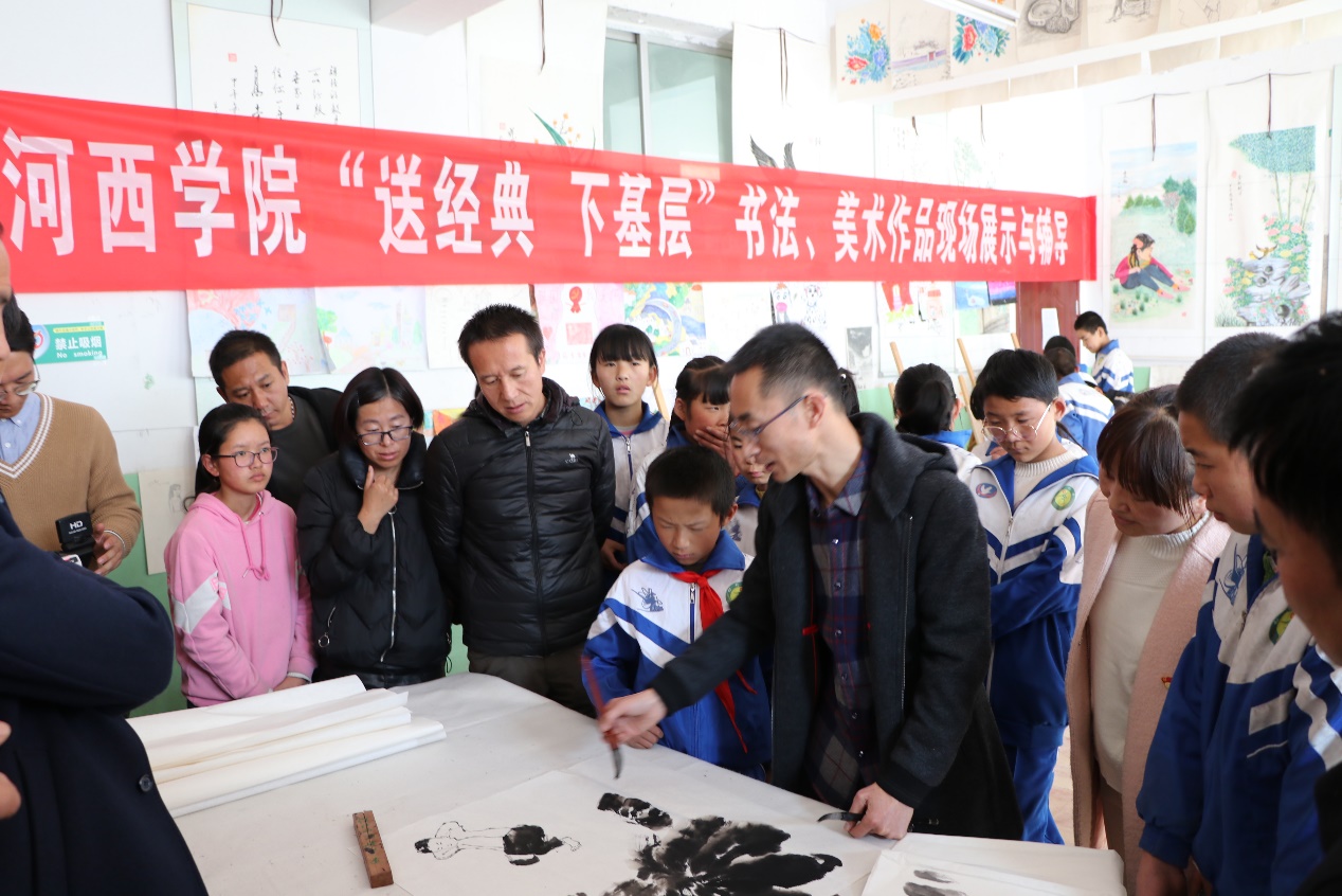 11月13日早晨,小分队赶到肃南县明花乡学校,分别做了普通话、中国传统文化和革命文化的报告,进行书法和绘画的现场展示和指导,捐赠了书法作品,并对明花小学的小学生主持人进行了诵读的专业辅导。