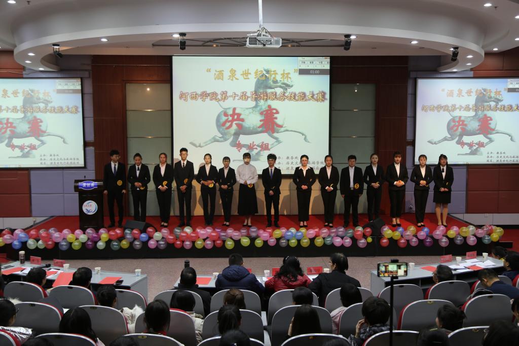 导游服务技能大赛经过初赛、复赛,专业组和非专业组各选出15名选手参加决赛。决赛从自我介绍、景点讲解、知识问答和才艺展示四个环节展示学生精神面貌、旅游文化知识和导游专业服务技能水平。30位选手以甘肃景点为内容,在导游大赛的舞台上为甘肃代言,用他们自己的风格诠释丝路文化。