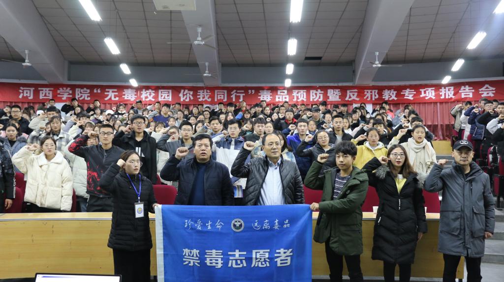 报告会还组织大学生安全服务志愿者开展了“珍爱生命 远离毒品”宣誓和授旗仪式,发放了禁毒宣传单。
