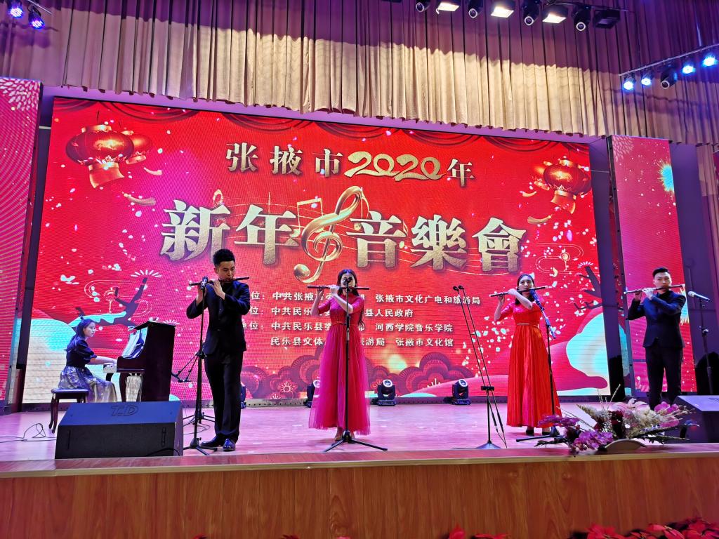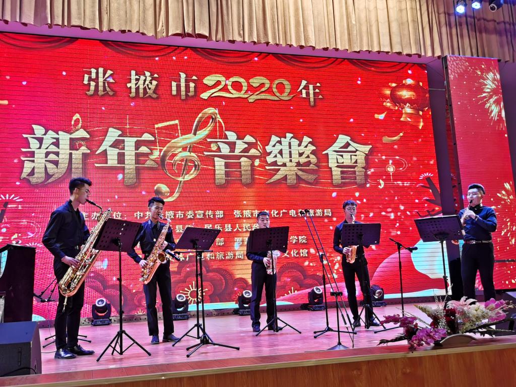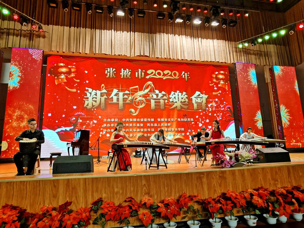2019年12月30日晚,由中共张掖市委宣传部,张掖市文化广电和旅游局主办的张掖市2020新年音乐会在民乐县影剧院上演。音乐学院师生应邀参加了演出。
