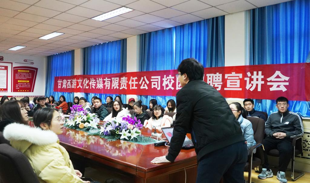 会上,甘肃西游文化传媒有限责任公司负责人介绍了公司概况、企业文化、工作环境、招聘岗位、薪资待遇、员工培养发展前景等情况,并重点介绍了本次企业校园招聘计划。随后,同学们也就普遍关注的福利政策、工资薪酬、晋升机制、发展空间等细节问题进行了详细咨询和互动交流。