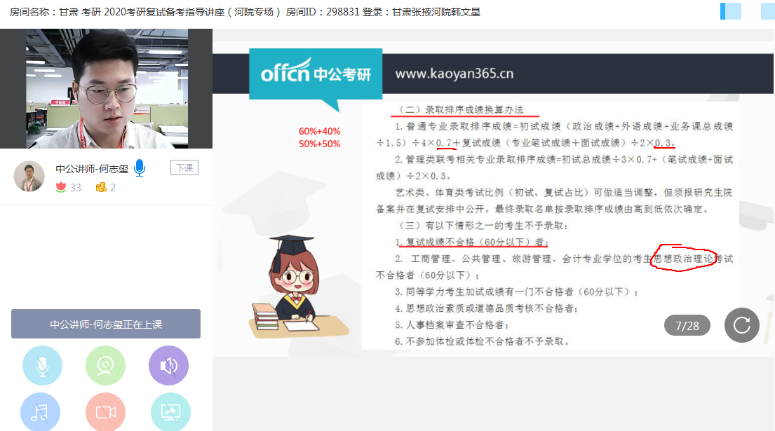 本次讲座由中公教育甘肃考研研究院资深讲师何志玺担任主讲,他从研究生复试、研究生扩招、研究生调剂等三个方面进行了详实讲解。同学们认真听讲、积极与老师互动,何老师在线为考研毕业生答疑解惑、耐心指导。