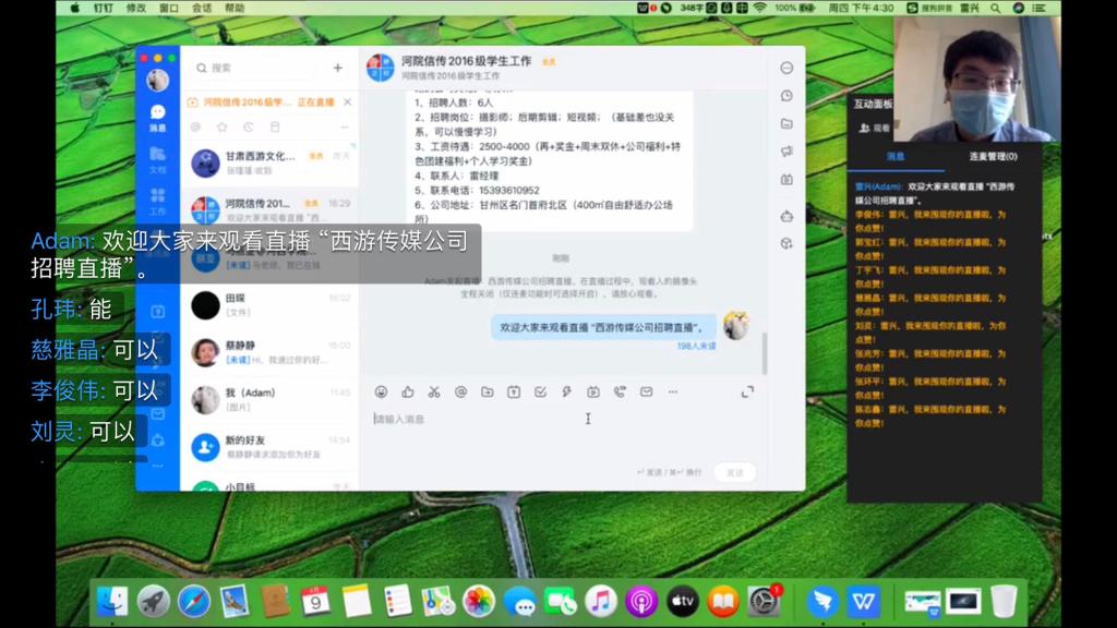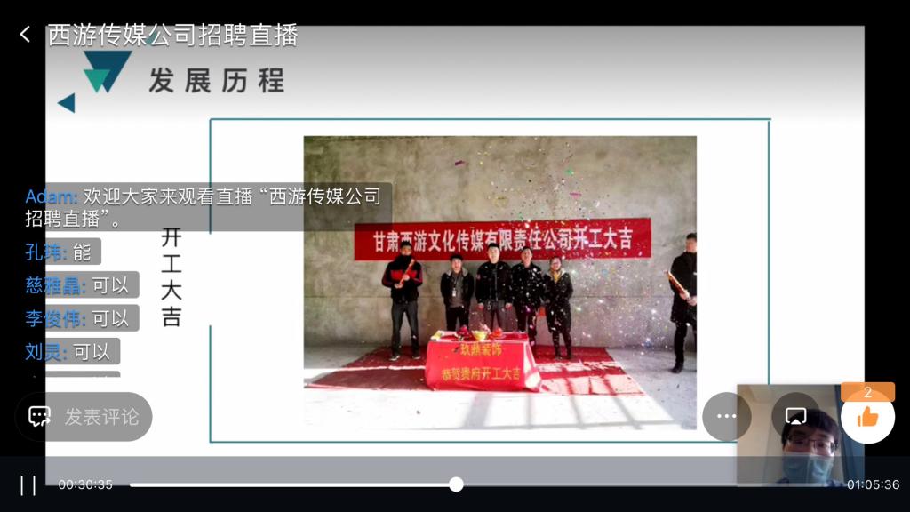 招聘会依托“陇政钉”政务移动办公平台,通过线上直播模式进行。宣讲环节,用人单位全面介绍了公司概况、组织架构、发展历程、工作环境、招聘岗位、薪资待遇、未来战略目标等内容,展示了公司近5年与各大高校、企事业单位合作完成的各类项目宣传片和影视作品,并提供了摄影、短视频制作、后期剪辑等6个就业岗位。交流环节,学生们积极提问,就普遍关注的福利政策、晋升机制、发展空间等细节问题进行了详细咨询和互动交流。
