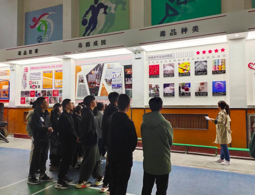 在风雨操场安全教育基地现场,13名学生讲解员轮流对前来学习和参观的学生进行了深入讲解,内容主要包括全球毒情、禁毒历史、禁毒范例、毒品危害、毒瘾成因、毒品种类、禁毒战例、涉毒案例、戒毒措施、禁毒法规等15项内容。另外,现场讲解还涉及了反对邪教、防诈骗反传销、拒绝网贷、消防安全和艾滋预防等内容。目前,已有41个班级1805名学生在安全教育基地现场听取讲解和参观了基地毒品预防教育主题墙,计划利用一周时间,完成对2020级140个班级5800余名学生进行全覆盖的毒品预防教育。