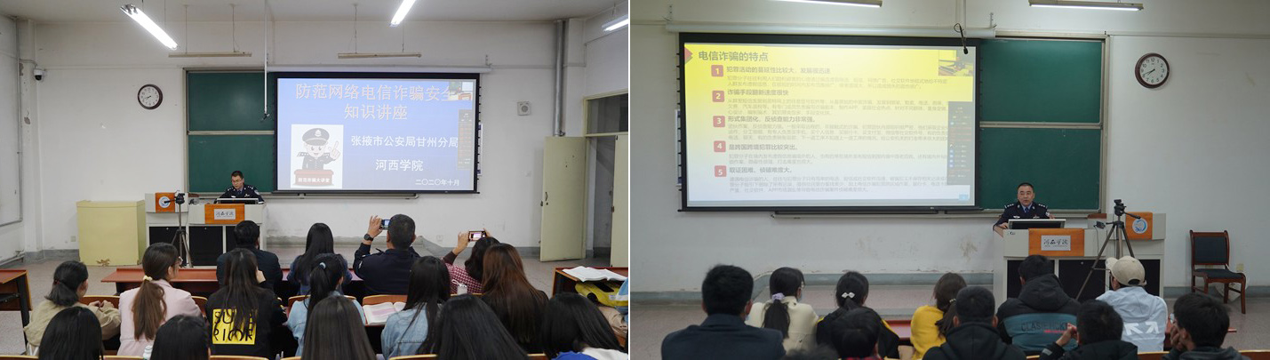 为从源头上预防各类电信诈骗和涉毒案件的发生,切实提高师生防骗和涉毒意识和防范技能,确保师生财产安全, 10月23日和10月29日,学校与张掖市公安局甘州分局举办了“预防电信诈骗”和“毒品预防”专题教育培训会,校本部15000余名学生以网络直播形式参加培训。