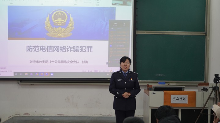 张掖市公安局甘州分局副局长李亚莲、甘州分局网络诈骗大队大队长付涛、甘州分局法治大队大队长李珍分别从不同角度,就电信诈骗案件的类型、形式、手段以及防范办法进行了讲解,并提醒大家要做到不随意泄露个人信息、不随意点击陌生链接、不轻易向陌生人汇款,发生贷款或被诈骗时及时寻求警方的帮助,并保存相关证据信息。甘州区禁毒委员会办公室副主任盛兴吉,就当前毒情形势分析、毒品的种类和危害、禁毒工作存在的问题和禁毒工作的应对措施进行了详细讲解。