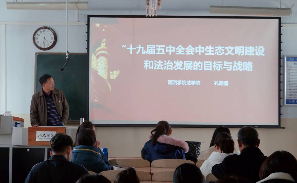 孔德播系统阐释了党的十九届五中全会的重大意义、重要成果、主要内容;深入分析了我国进入新发展阶段的重要特征,准确把握2035年远景目标和“十四五”时期我国发展主要目标和重点任务。结合河西走廊生态保护的现状,重点讲解了五中全会有关生态文明建设的规定和2035年基本实现“建设人与自然和谐共生的现代化”远景目标、新发展阶段生态文明建设领域的挑战及对策,认为生态文明是人类文明的重要组成部分,我国的生态文明建设将会取得新的历史性成就,必将建成美丽中国。