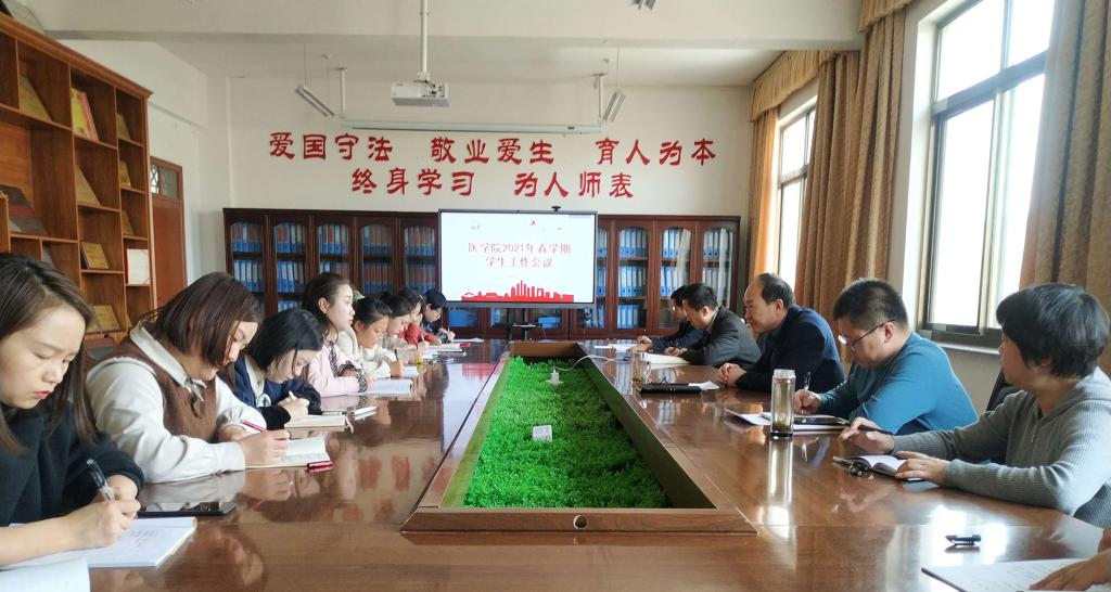 3月5日,医学院召开春学期学生工作会议,全面安排布置2021年度学生工作。会议提出2021年学院学生工作坚持以“保安全底线、促稳步就业、创品牌特色”的基本思路,重点抓好五个方面的工作:一是深入开展思想政治教育。加强政治理论学习,开展红色观摩实践,深化党史学习教育,弘扬党的光荣传统和优良作风,充分发挥党组织的政治核心和党员先锋模范作用;二是进一步强化行为养成教育。切实强化社会公德、安全文明、遵纪守规教育。做好学生心理疏导,防止各类网络诈骗,树牢意识形态、安全意识;三是全力做好毕业生就业服务指导。全方位教育引导就业观念转变,多形式收集提供就业信息,多渠道搭建就业平台,多层次改进学生工作机制,切实推进毕业生就业工作;四是切实加强学生工作队伍建设。不断优化班主任队伍、辅导员队伍和班团干部队伍结构,深化与学生关心关爱和沟通联系渠道建设,强化育人功能,推进学风建设;五是积极凝练学生活动特色品牌。规范社团管理,发挥社团功能,凝练学院特色。