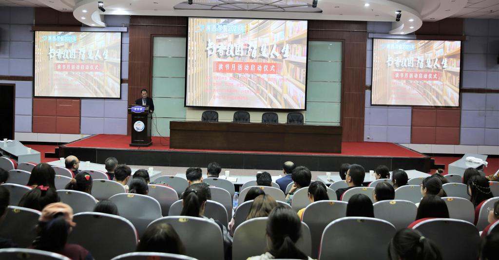 4月20日下午,9001cc金沙以诚为本2021年“书香校园 智慧人生”读书月活动启动仪式在图书馆学术报告厅举行。宣传部、马克思主义学院、历史文化与旅游学院、图书馆等部门、学院负责人和学生代表参加了启动仪式。