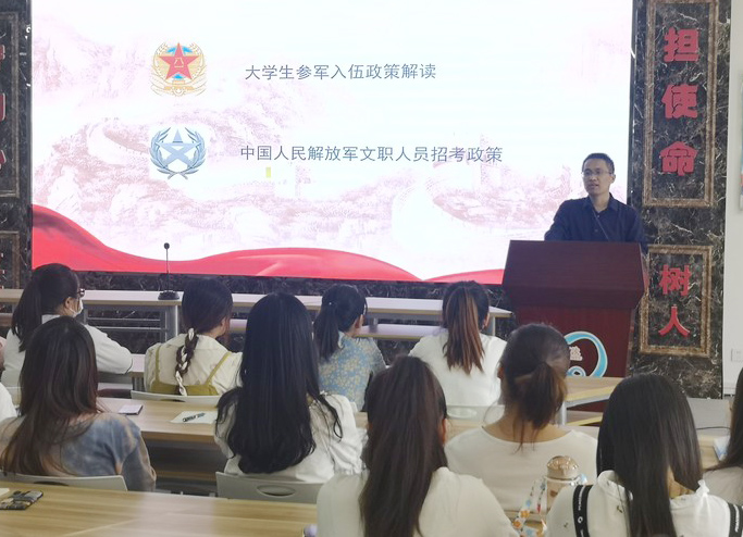 甘肃省征兵工作先进个人、学工部教育管理科科长常明涛以“携笔从戎不负韶华”为题,分别围绕大学生应征入伍的重要意义、个人成长“三笔账”、入伍基本流程及女大学生应征入伍政策等进行了讲解;解读了中国人民解放军文职人员招考政策,特别是针对军队文职人员岗位、报考条件、招考程序、如何面试等方面进行了辅导。