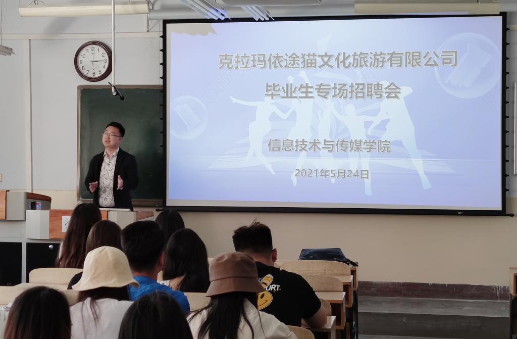 新疆克拉玛依途猫文化旅游有限公司招聘人员就公司的基本情况、发展前景、招聘岗位及要求、薪资待遇等作了介绍,并耐心解答了同学们的疑问,希望大家能积极就业,展现自己的才能、施展自己的抱负。
