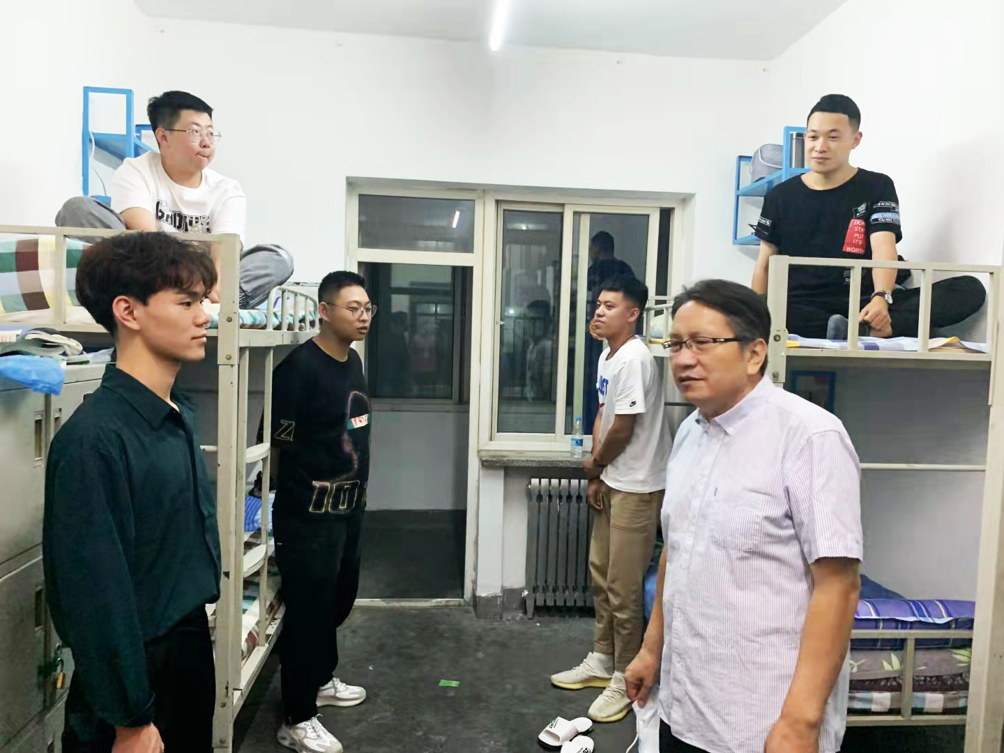 9月10日晚,信息技术与传媒学院领导、班主任、辅导员一行深入学生宿舍看望2021级新生。