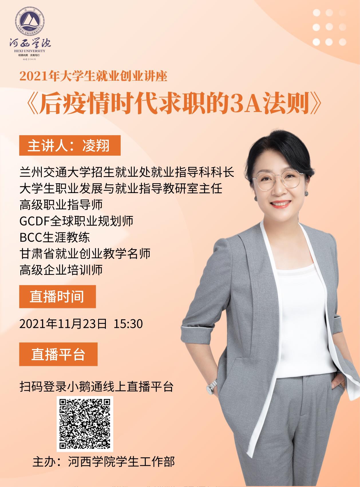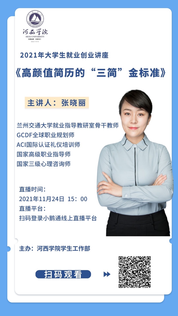 11月23日至24日,就业指导工作办公室邀请甘肃省就业创业入库导师、兰州交通大学就业指导骨干教师开展《高颜值简历的“三简”金标准》和《后疫情时代求职的3A法则》就业指导专题系列讲座。两场直播讲座观看人数达到14000多人,讲座内容备受学生青睐,深受全校师生好评。
