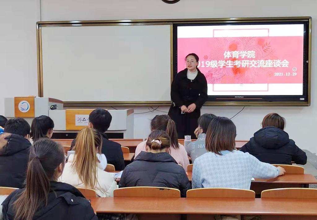 12月29日下午,体育学院举行了2019级学生考研交流座谈会。学院领导、班主任和部分刚参加完2021年研究生考试的学生代表参加了交流座谈。
