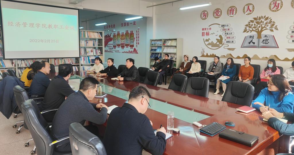 2月25日,经济管理学院召开党总支会议和新学期工作安排会议。会议深入研究了上年度工作完成情况、2022年新学期党建、学科建设、教学、科研、就业、创新创业、服务地方和疫情防控等工作,并进行了具体安排部署。
