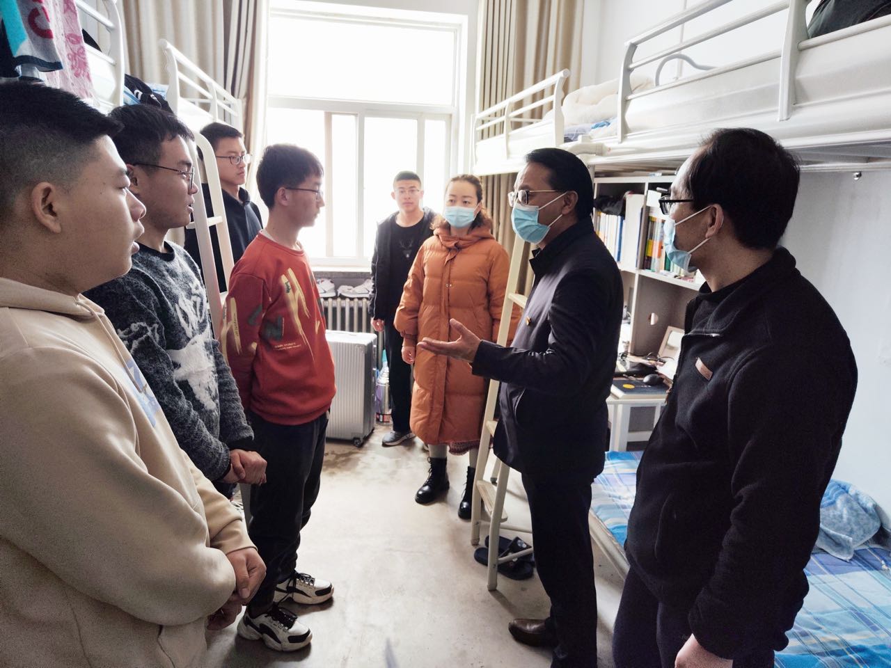 在走访过程中,学院领导、老师与同学们亲切交谈,仔细询问学生家庭情况、假期学习及返校后的核酸检测情况、学生本学期的学习计划等;并就疫情防控、网络电信诈骗、校园贷、学生宿舍内务卫生进行了强调,叮嘱学生之间要相互团结,提高自身安全防范意识,制定新学期计划和目标。走访中,学院领导老师还针对2022届学生的考研复试等问题进行了答疑。