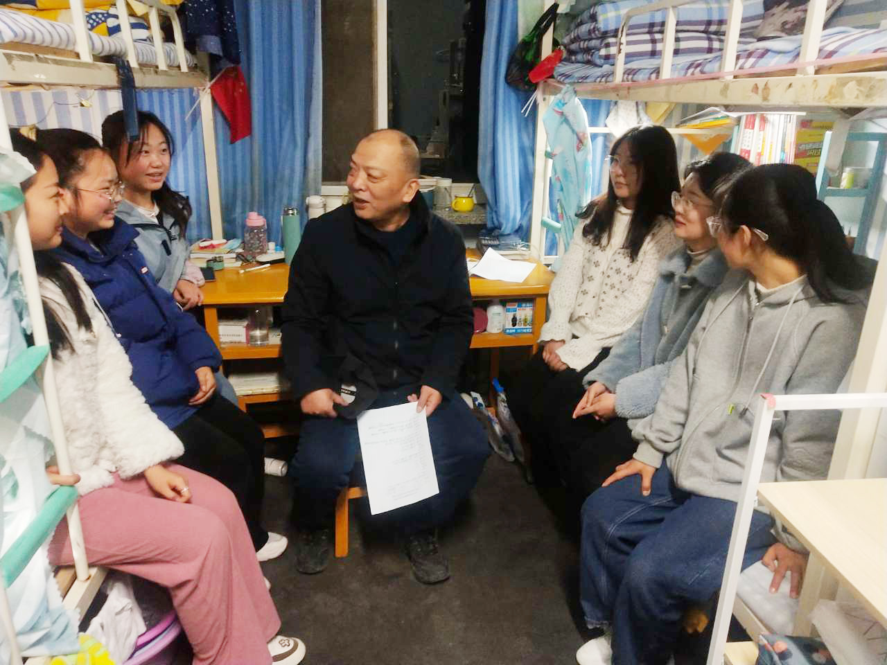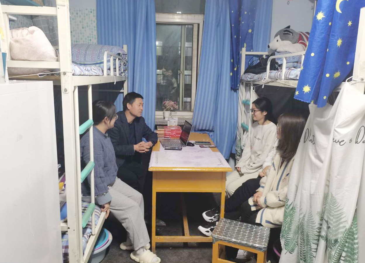 3月2日晚,数学与统计学院教工支部组织全体教师党员深入学生宿舍,开展“教师党员进宿舍 引领学子创文明”主题党日活动。根据学院党委和教工支部前期策划安排,教师党员深入2018级毕业班学生宿舍,与学生开展面对面的交流和谈心谈话,对学生考研情况、就业动向、毕业论文进展和学业完成情况等进行摸底,开展安全教育和疫情防控宣讲,督促学生养成良好的学习生活习惯,引导学生树立正确的世界观、价值观和人生观,自觉遵守法律法规、校纪校规,珍惜校园生活,规划好人生之路,知荣辱、懂感恩,以积极乐观、健康文明的新风貌迎接新学期。同学们积极回应老师的询问、指导和关爱,谈对专业学习和校园生活的感受、谈自己的就业、人生目标和下一步努力的方向,还向老师请教了关于学习、考试、就业上的一些问题与困惑。