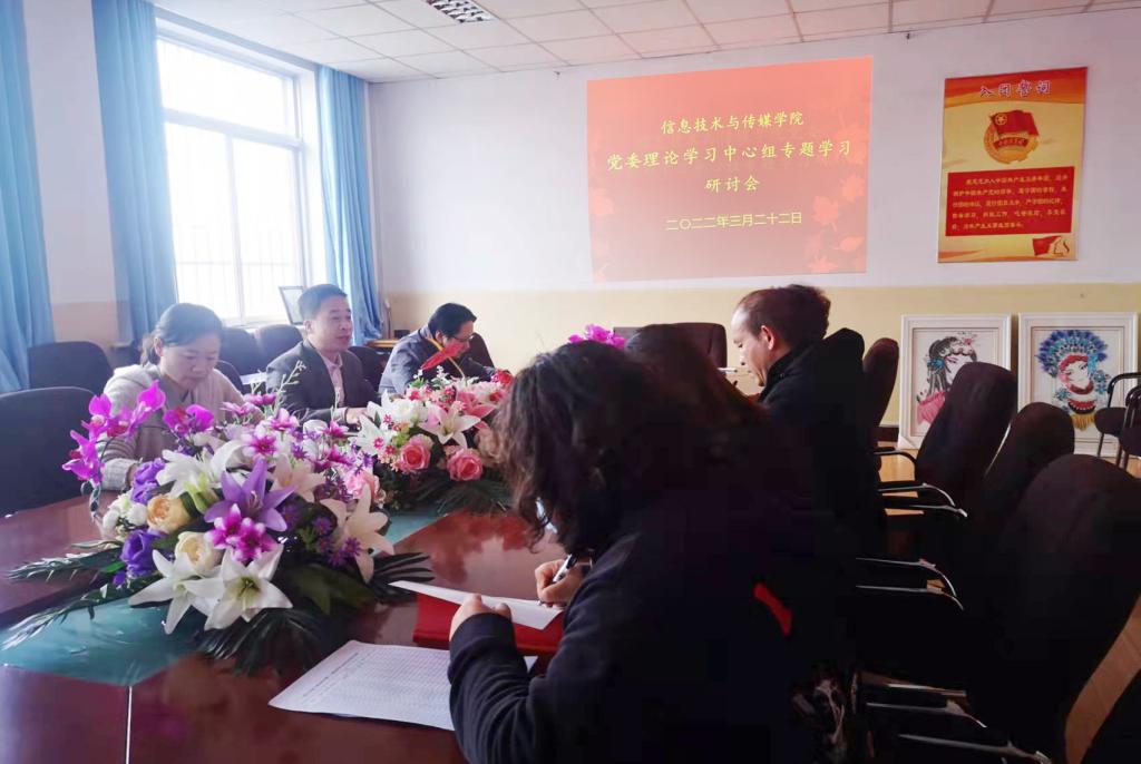 3月22日下午,信息技术与传媒学院召开党委理论学习中心组专题学习研讨会,中心组全体成员参加了会议。
