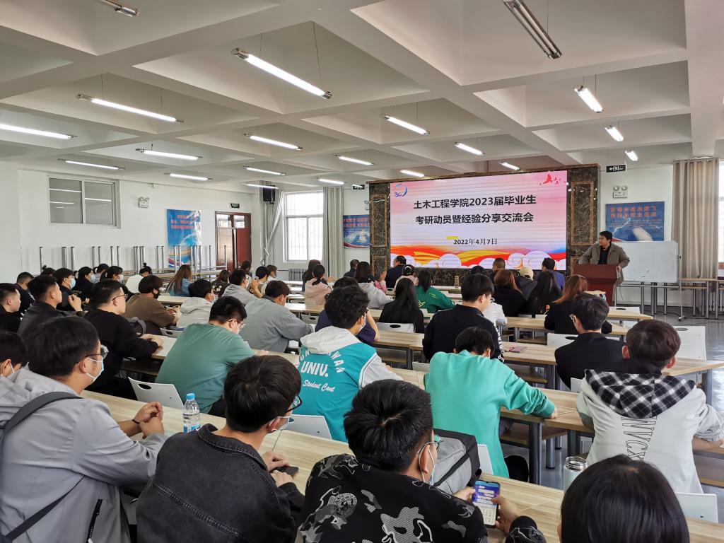 为充分调动同学们的考研积极性,更好的挖掘自身潜能,把握深造机会, 4月7日下午,学院召开了“以梦为马 不负韶华”为主题的2023届(2019级学生)考研动员暨经验分享交流会。土木工程学院领导、2019级班主任、就业专干及2019级全体学生参加了本次动员大会。