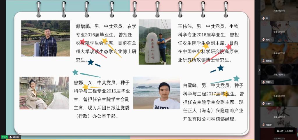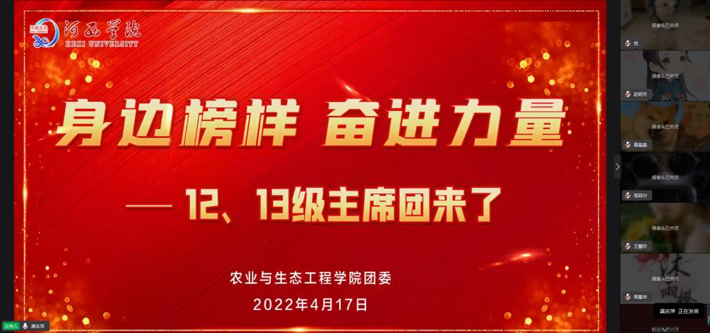 为充分发挥身边榜样的激励作用,发扬学生会“传、帮、带”优良作风,进一步提升学院团委学生会成员工作能力,树立优良的学习典范,做好职业生涯规划,增强学生会凝聚力,带动优良学风建设。4月17日,农业与生态工程学院团委组织召开“身边榜样 奋进力量——12、13级学生会主席团来了”线上经验分享会。学院团委全体老师、学生会全体成员、学生骨干70余人参加。2012级、2013级学生会主席团4人应邀参加并作了经验分享。